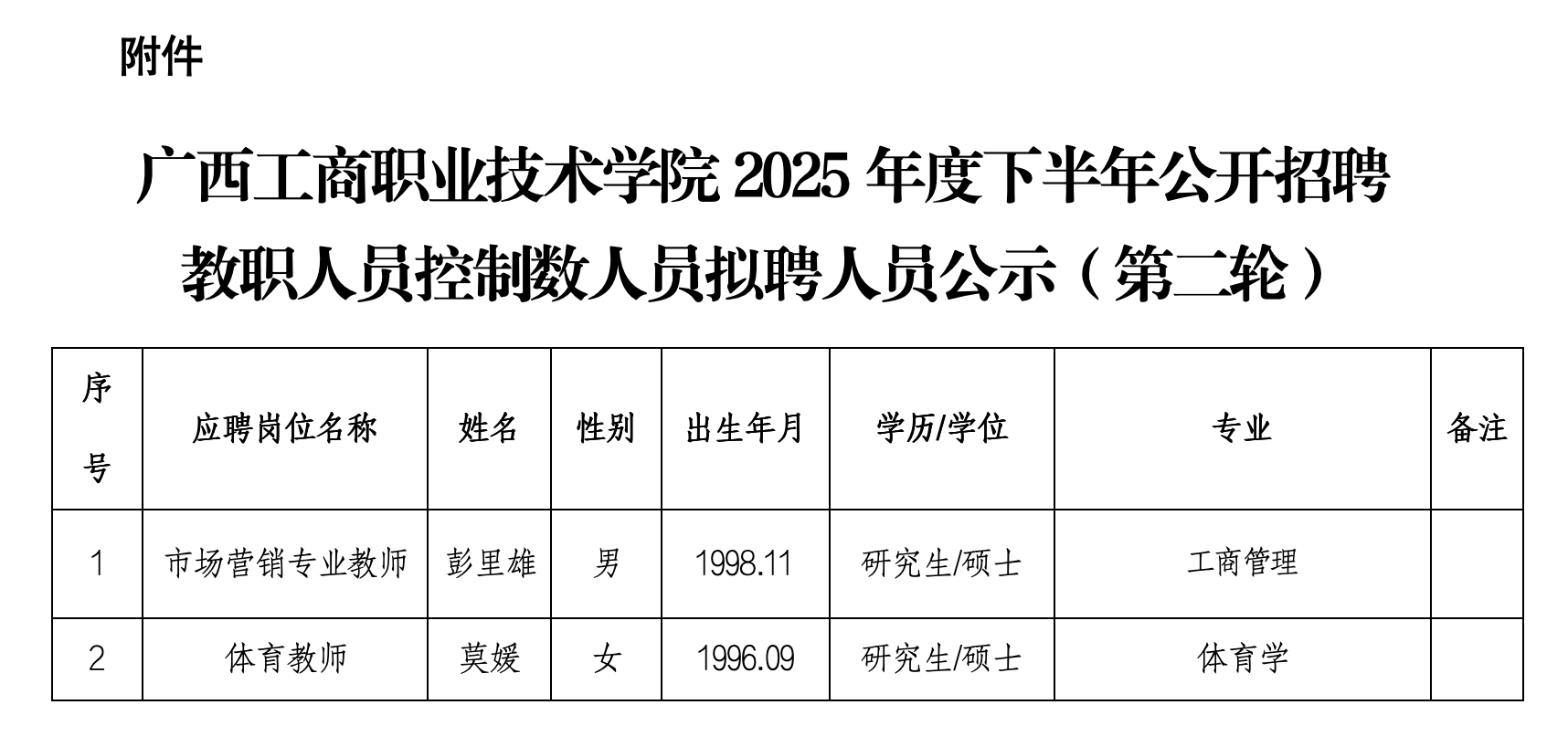附件:廣西工商職業(yè)技術(shù)學(xué)院2025年度下半年公開招聘教職人員控制數(shù)人員擬聘人員名單(第二輪)