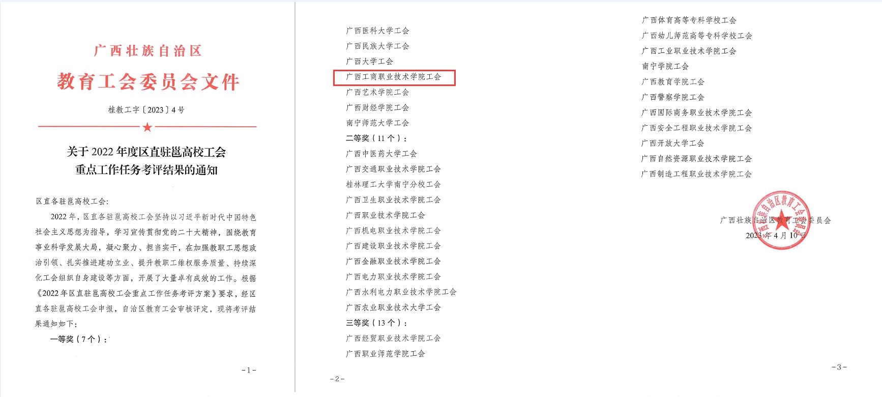 • 近日,從自治區(qū)教育工會公布的2022年度區(qū)直駐邕高校工會重點工作任務考評結(jié)果知悉,我院工會獲得考評一等獎(共有7家駐邕高校工會獲一等獎),也是區(qū)直駐邕高校中唯一一所獲得一等獎的高職院校。(通知文件)