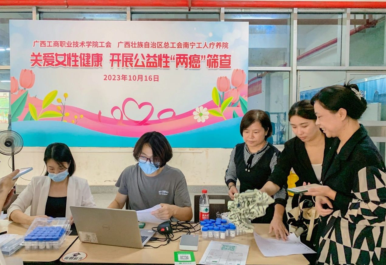 • 10月16日下午,學(xué)院與廣西壯族自治區(qū)總工會南寧工人療養(yǎng)院在鵬飛校區(qū)開展“關(guān)愛女性健康 開展公益性‘兩癌’?篩查”體檢服務(wù),為學(xué)院一線女教職工體檢。(活動現(xiàn)場)開展公益性“兩癌 ”篩查服務(wù)活動是自治區(qū)總工...