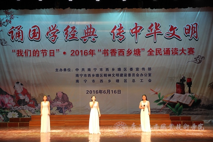 • 2016年6月16日,在廣西財經(jīng)學院舉辦中共南寧市西鄉(xiāng)塘區(qū)委宣傳部、南寧市西鄉(xiāng)塘區(qū)精神文明建設委員會、南寧市西鄉(xiāng)塘區(qū)總工會主辦“誦國學經(jīng)典,傳中華文明”的比賽。由我院公共基礎部梁曉霞老師率隊,帶領學院韋思...